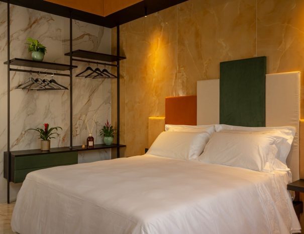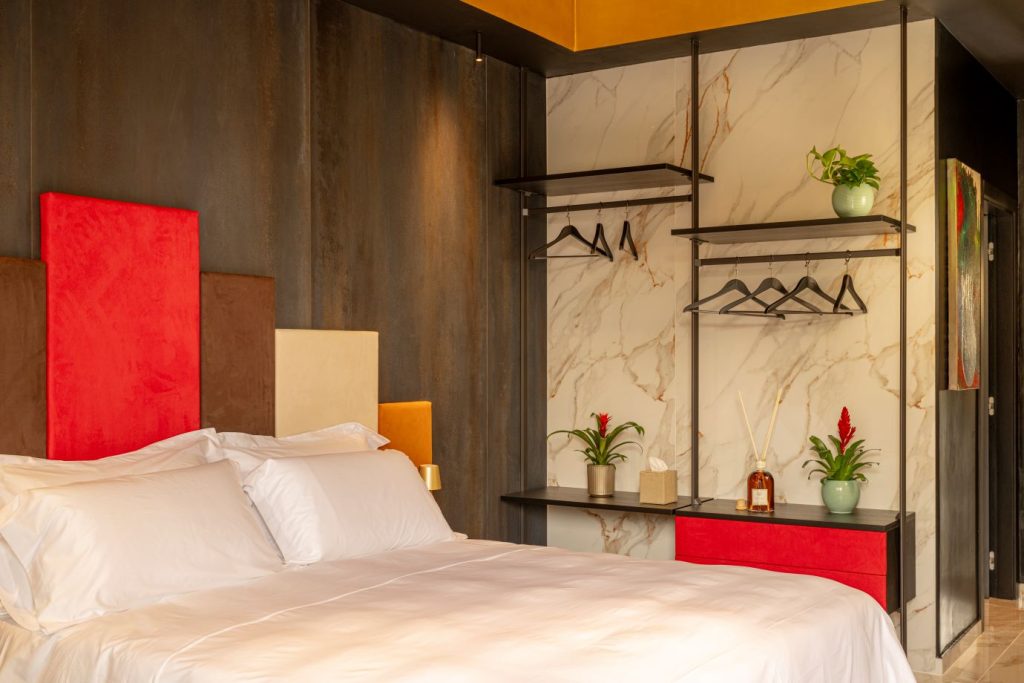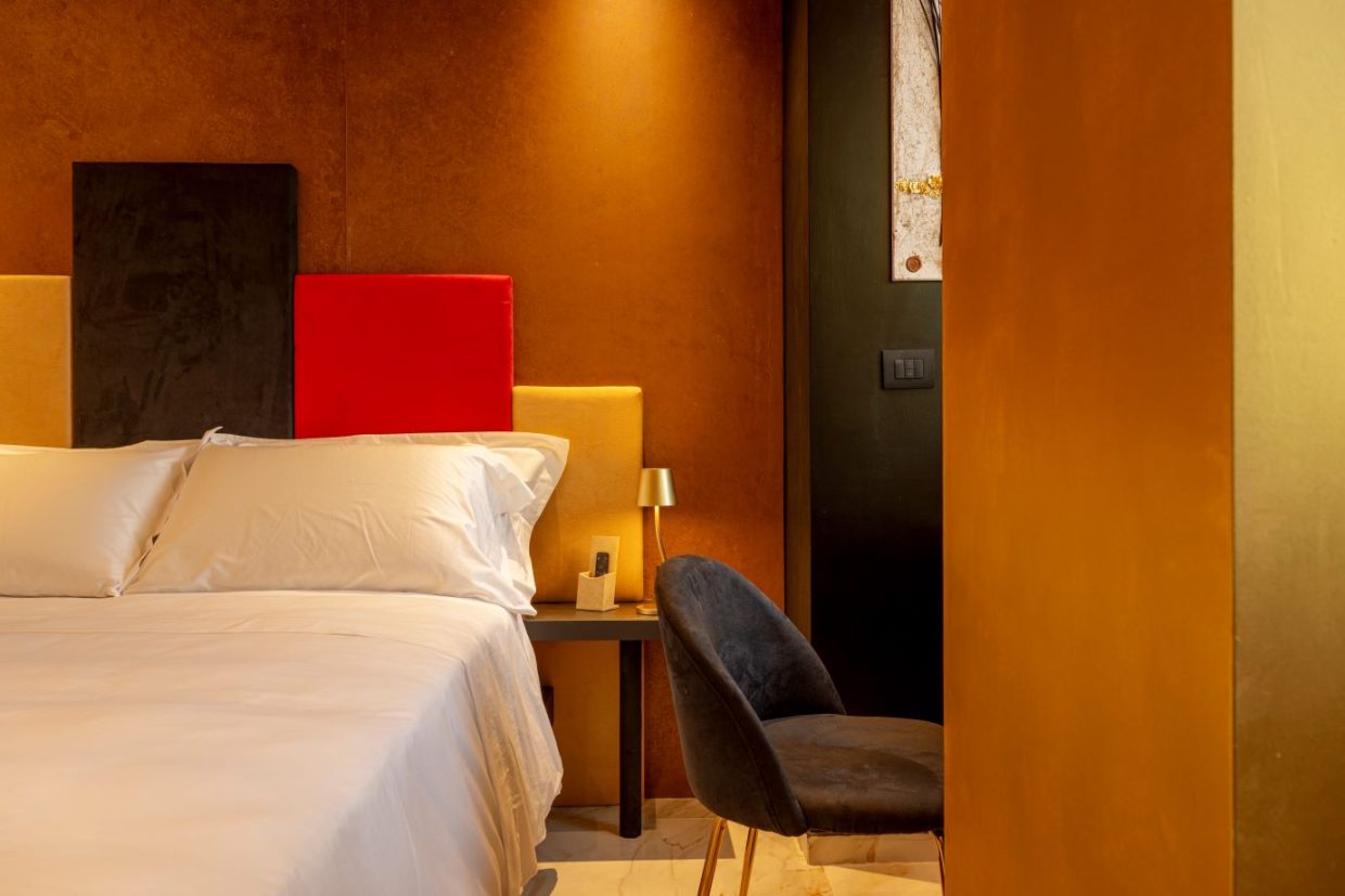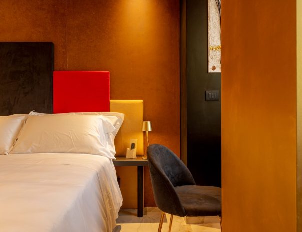 Rosso fuoco, il colore conduttore di questa stanza. Rosso come la passione di Eleonora per il teatro, a detta di molti sotto alcuni aspetti enfatici: UNA DIVA. La stanza ci regala un comodo spazio di lavoro o di relax, tisane della massima qualità e del cremoso caffè Vergnano. Un fornito frigo bar vi assicurerà di soddisfare ogni piccola voglia. Il riposo è garantito da un avvolgente materasso 28 cm munito di topper, doppi cuscini e trapuntino quattro stagioni. Aria condizionata, bagno privato, cassaforte, smart tv, wifi gratuito, alexa e l’ accesso digitalizzato sono i punti di forza della nostra struttura.
